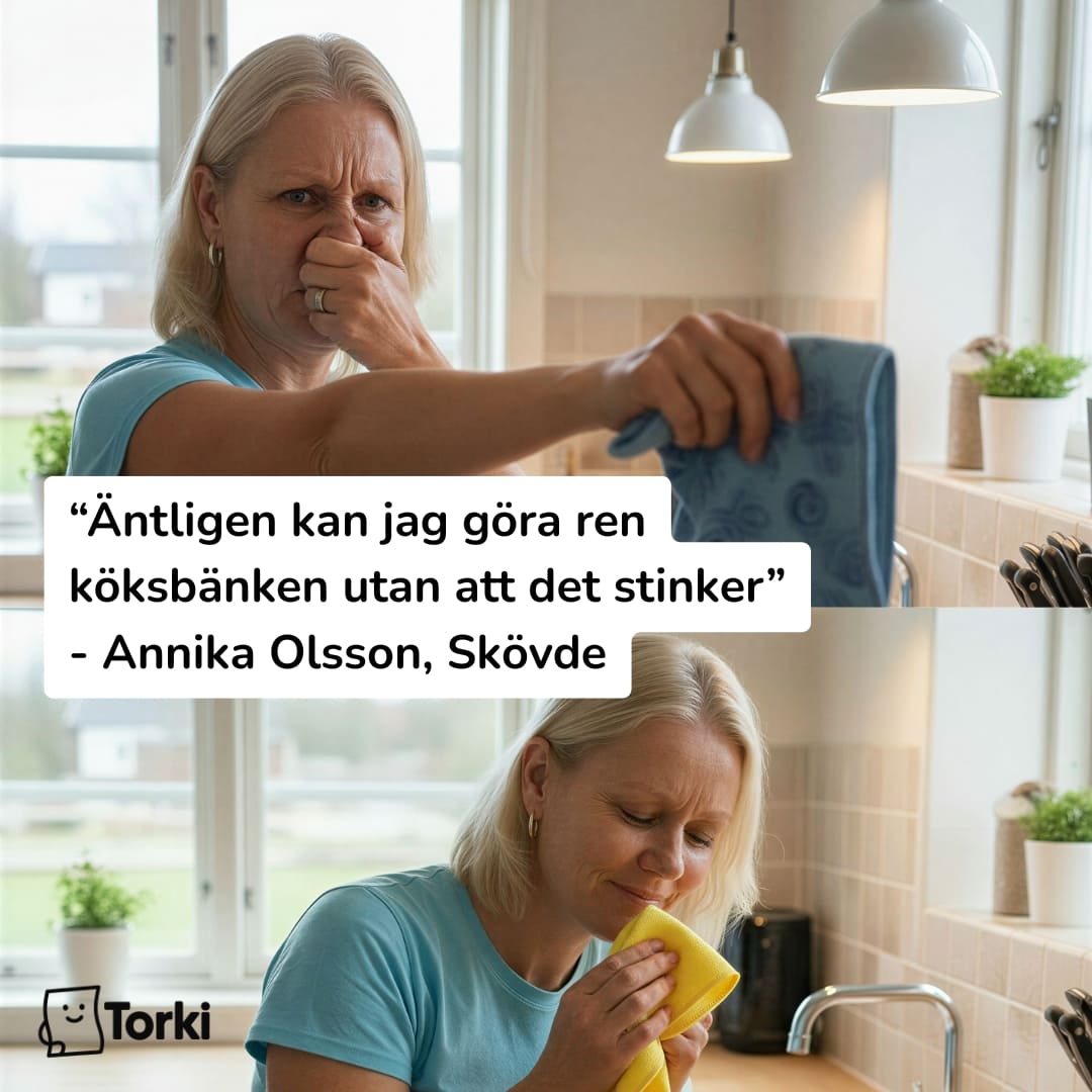 Torki är tillverkat av en högkvalitativ mikrofiberblandning som både absorberar effektivt och torkar snabbt. Materialet håller sig fräscht betydligt längre än en vanlig disktrasa, torkar snabbare och börjar inte lukta lika lätt. Det är skonsamt mot alla ytor och kan tvättas och återanvändas många gånger.